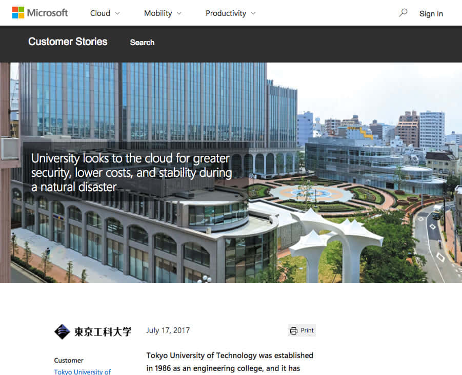 東京工科大学が開設した関係者向け緊急お知らせサイトである「東京工科大学 緊急用お知らせサイト」とイントラサイトの2つのサイトはMicrosoft Azureを採用したことで災害時でも確実に機能するウェブサイトを構築した。