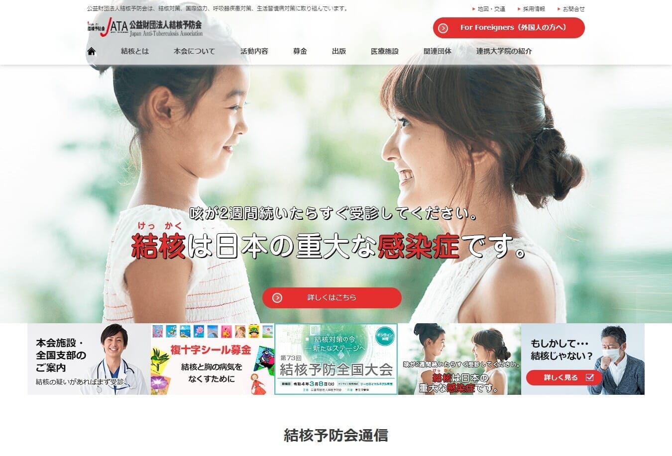 結核が縮小した昨今は、結核の撲滅に向けた研究はそれまで通り行いつつ、結核治療において培った呼吸器官系の知識や経験を生かし、呼吸器官系の疾患治療はもちろんのこと、がんや生活習慣病などの医療分野に対しても高度な専門性を発揮して取り組んでいる。 そんな結核予防会では先般、結核対策の普及・啓発に努めるべくWebサイトをリニューアルした。これによって、民間に向けてより積極的な情報提供を行い、国際協力を含めた同団体の活動への理解を深めてもらえるよう活用しているという。