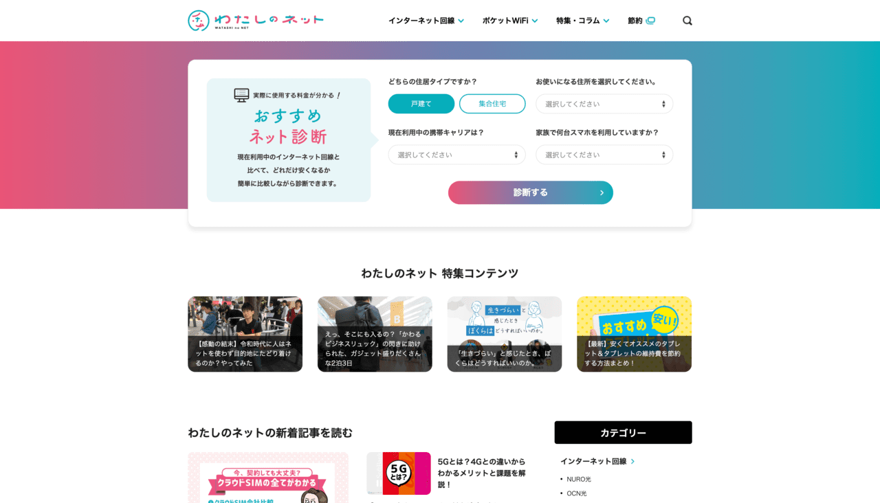Think株式会社によって運営されている「わたしのネット」は、インターネット回線やWi-Fiなどの通信商材に関わる基礎知識や、各プロバイダが提供するサービスの特徴、評判、解約方法などの情報を集約し、読者にわかりやすく紹介をしているサイトだ。