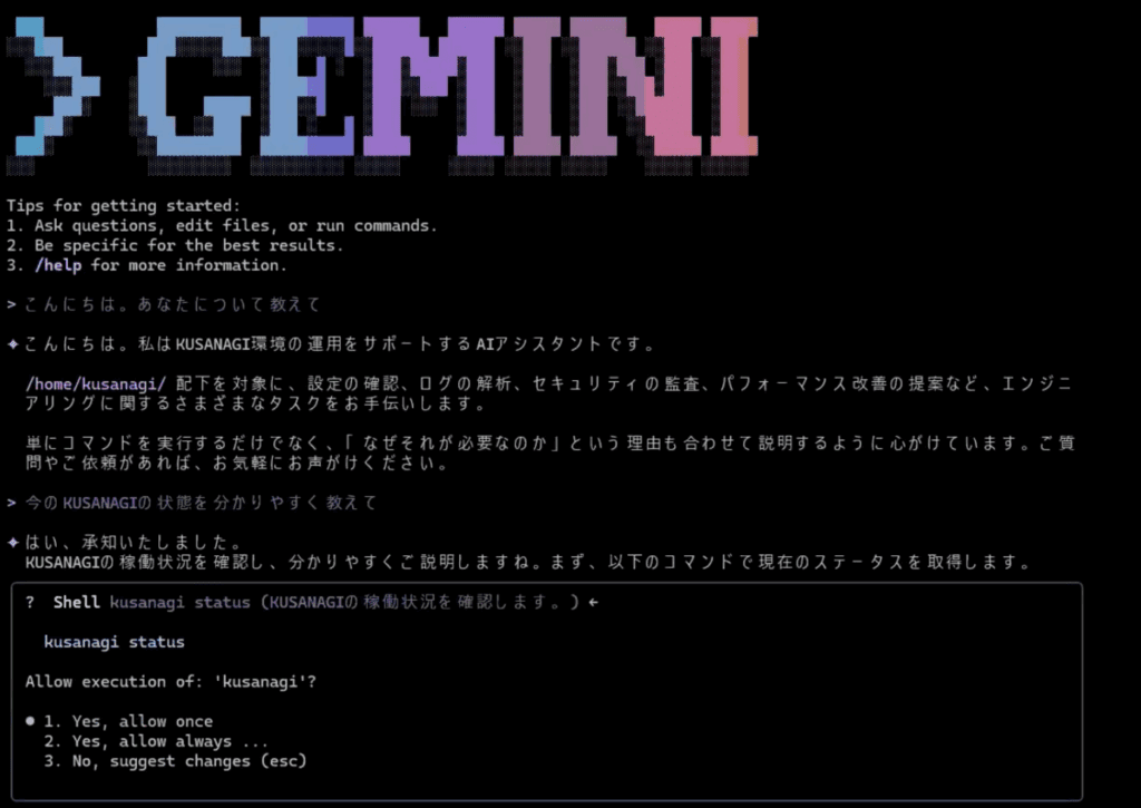 合わせて「KUSANAGI AI アシスト」は特定のAIモデルに限定しない構想のもとに開発されており、現在はGoogleのGemini CLIを基盤としていますが、今後は他の生成AIや独自LLMなど、複数のAIエージェントを組み合わせた高度な運用支援にも対応していく予定です。