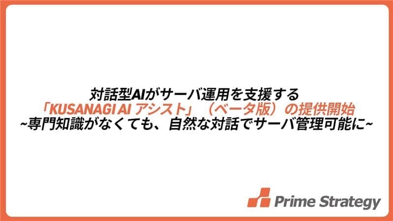 プライム・ストラテジー株式会社(代表取締役 吉政 忠志、本社所在地:東京都千代田区、以下「プライム・ストラテジー」)は、超高速CMS実行環境「KUSANAGI」の新たな機能として、対話型AIがサーバ運用を支援する「KUSANAGI AI アシスト」のベータ版を発表し、KUSANAGI 9の利用者を対象に無償で提供を開始しました。