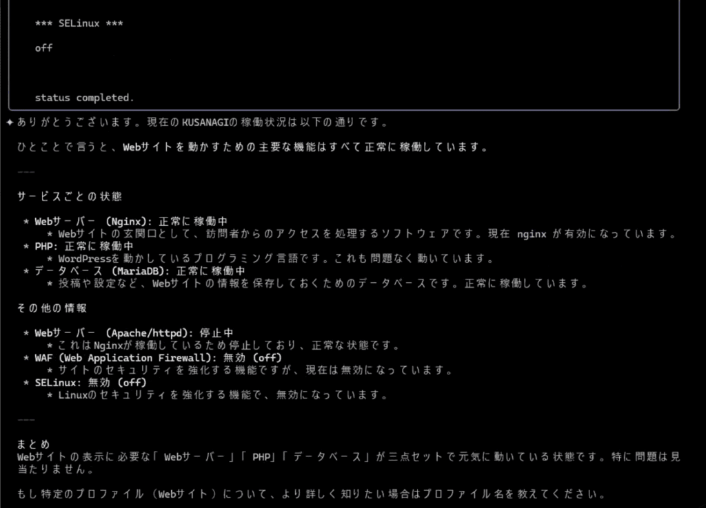 『KUSANAGI AI アシスト』は、その理念をAIの力で拡張し、誰もが安心して創造的な活動に集中できる環境を実現します。このAIアシストを通じて、ユーザーの皆様とともにサーバ管理の未来を創造していきます。」