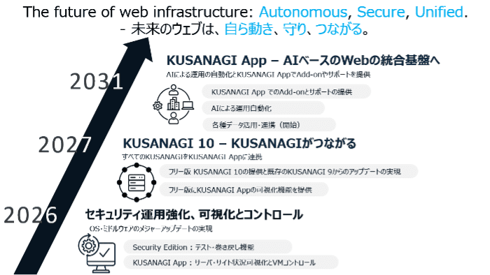 「KUSANAGI AI アシスト」は、KUSANAGIの次世代コンセプトである「自ら動き、守り、つながる」Web基盤 への進化を加速させる重要なステップです。